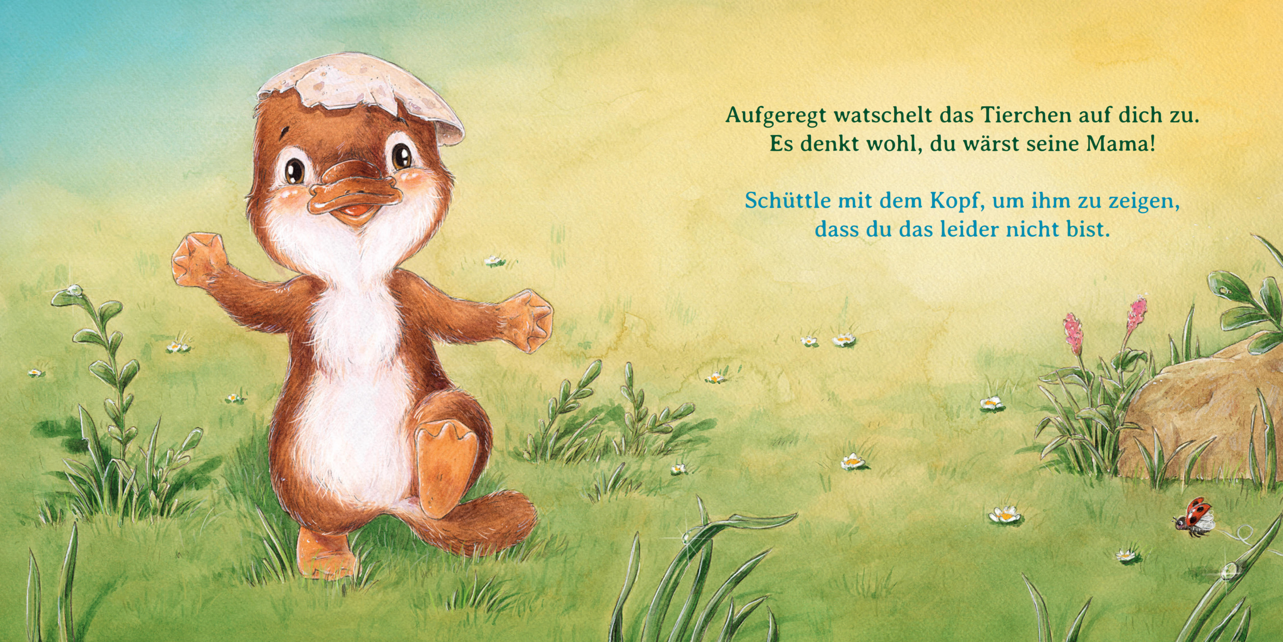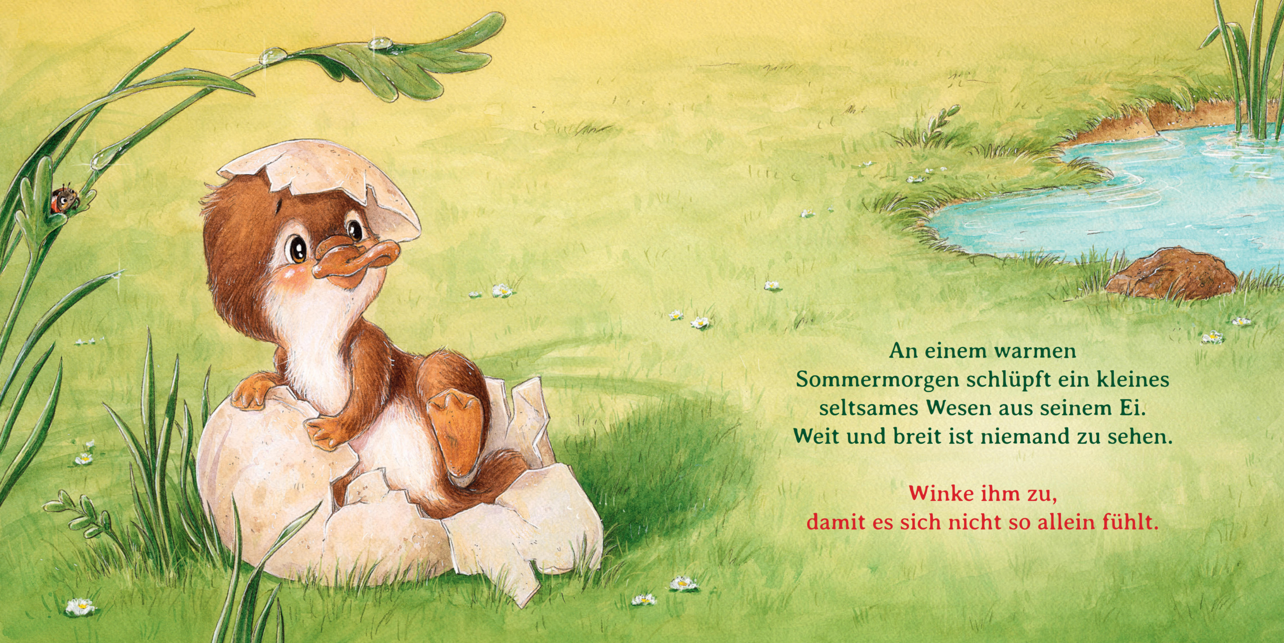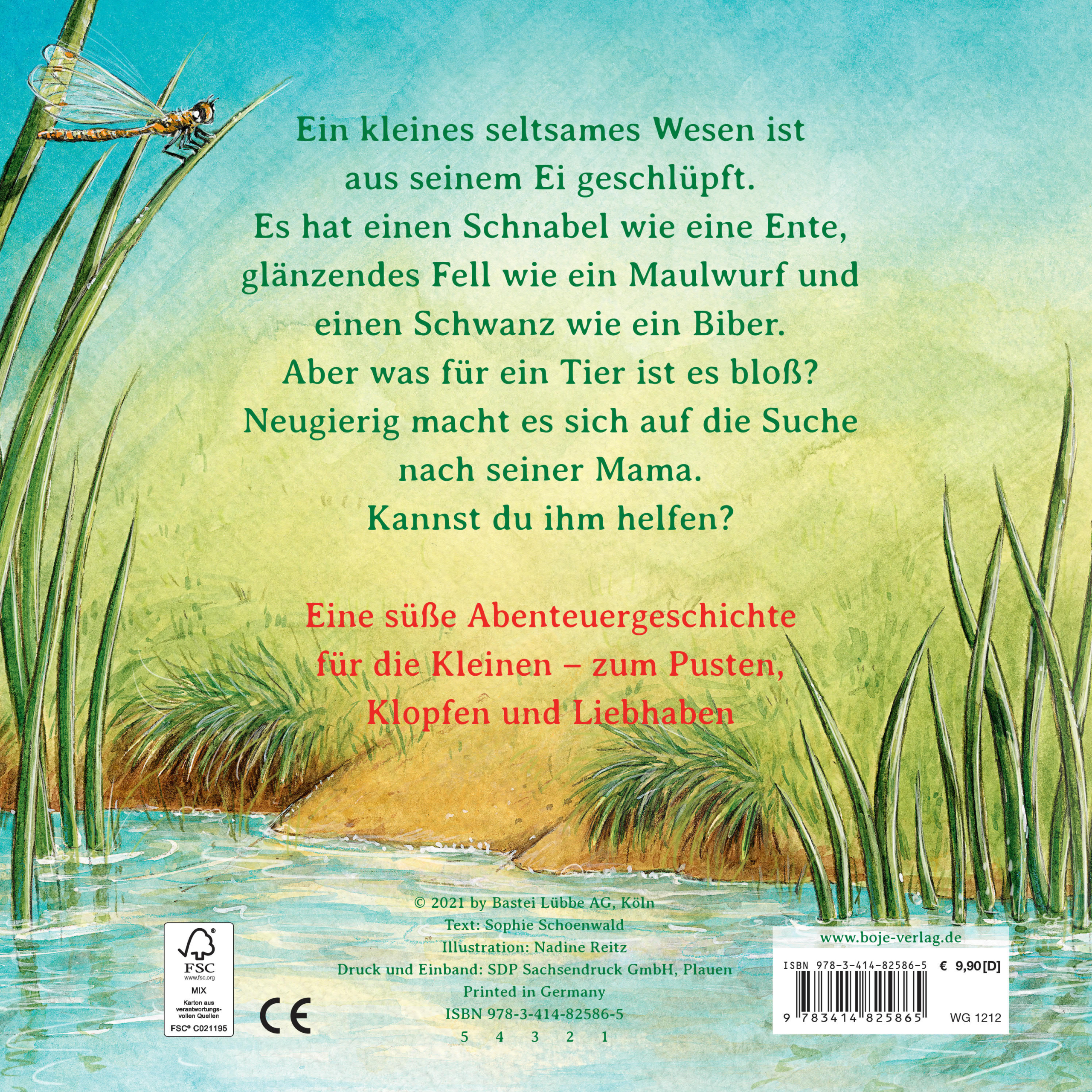 An einem warmen Sommermorgen schlüpft ein kleines seltsames Wesen aus seinem Ei. Es hat einen schönen Schnabel wie eine Ente, glänzendes Fell wie ein Maulwurf und einen Schwanz wie ein Biber. Neugierig macht sich das Tier auf die Suche nach seiner Mama und einem Ort, wo es hingehört. Kannst du ihm dabei helfen?